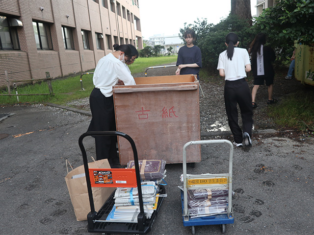 エコステーションで、古紙の回収を行っています。プリントやレポート用紙など、エコステーションで回収した古紙を、学内の古紙回収BOXに運ぶという活動です。古紙回収BOXに入れられた古紙はトイレットペーパーにリサイクルされ、本学に還元されています。令和6年度は計2回の回収を行いました。