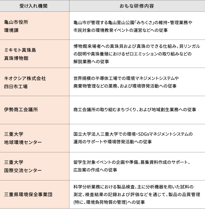 令和5年度には、キオクシア株式会社と伊勢商工会議所でのインターンシップも再開となりました。令和6年度には本学の地球環境センター、国際交流センターの2つの学内施設へのインターンシップが始まりました。令和7年度には、自然と共生し、環境負荷の少ない持続可能な社会の実現に向け、“科学分析”、“環境コンサルティング”、“産業廃棄物の最終処分”などに取り組むことで、社会の豊かな環境づくりに貢献されている三重県環境保全事業団へのインターンシップが始まりました。受講生は、亀山市役所では、里山公園の維持・管理業務や環境イベントを通じて、市民への環境啓発活動に従事します。ミキモト真珠島真珠博物館では、真珠や真珠貝について、真珠養殖が与える環境への効果と合わせて来場者へ解説する業務などに従事します。キオクシア株式会社では、世界規模の半導体工場での環境マネジメントシステムや廃棄物管理などの業務、および環境啓発活動に従事し、伊勢商工会議所では、市街地の環境といった側面から、まちづくりや地域創生に関する業務に従事します。地球環境センターと国際交流センターでは、普段、学生として過ごしているだけでは中々かかわることの無い施設であり、大学が教育以外にどのような社会貢献や環境活動を行っているか学ぶことができます。三重県環境保全事業団では、科学分析業務における製品検査、主に分析機器を用いた試料の測定、検査結果の記録および評価などを通じて製品の品質管理(特に、環境負荷物質の管理)へ従事します。(表1)