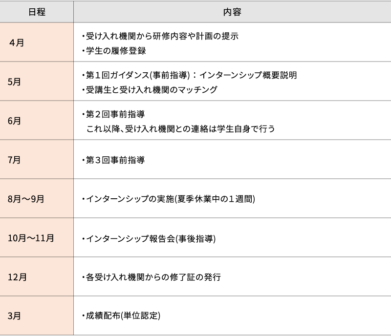 受講生は、大学での事前指導を受け、自身で各機関の担当者と連絡を取り合い、打ち合わせや事前の準備などを進めて、夏季休業期間中(8月~9月)に一週間のインターンシップに参加します。(表2)