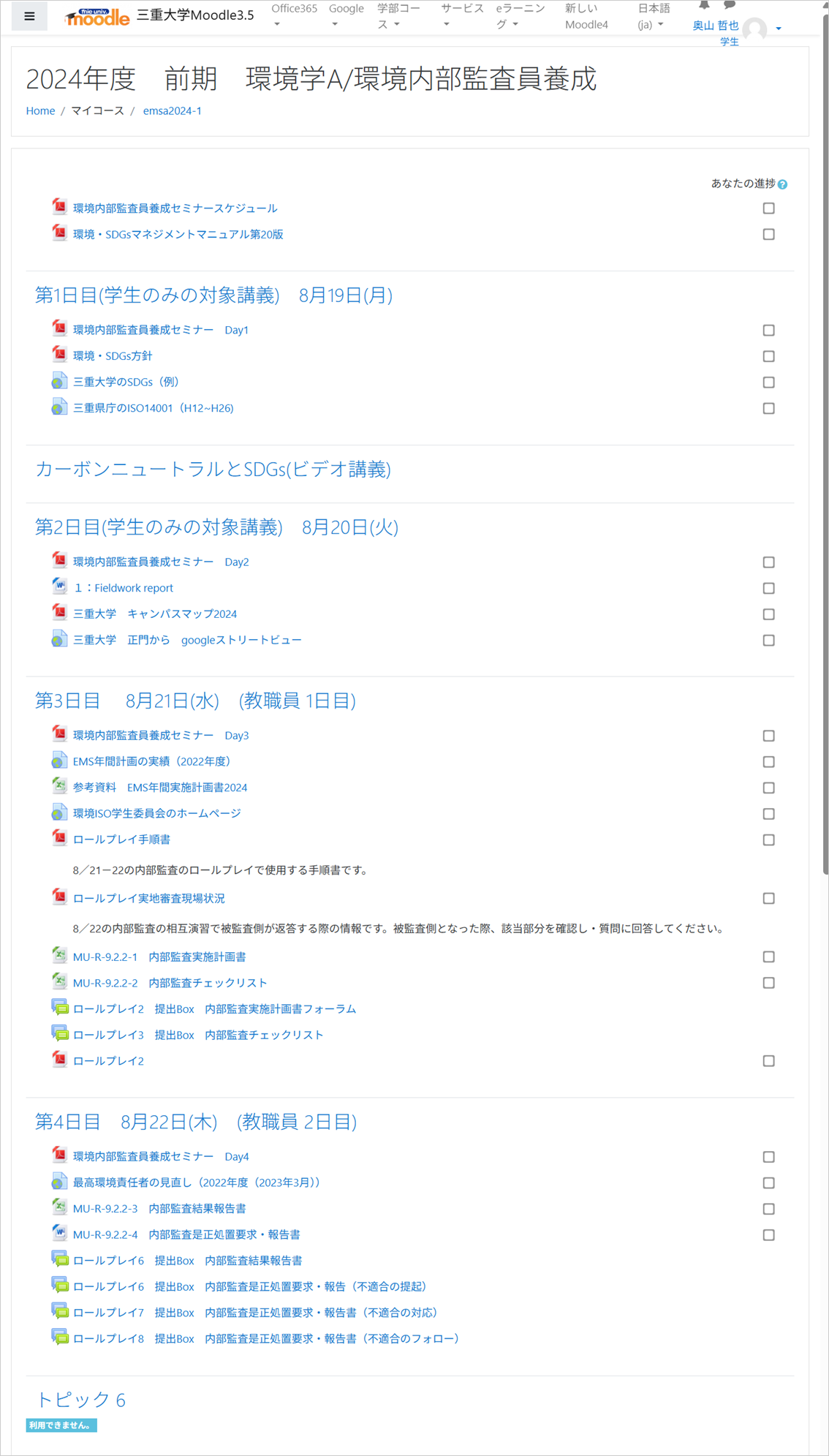 令和6年度の環境内部監査員養成セミナーは、学生対象の共通教育の授業として前期(令和6年8月19日から22日)の集中講座(90分×15コマ)が開催され2名の学生に環境内部監査員の資格を付与しました。講義では、教職員18名も加わりグループディスカッションを主に行いました。