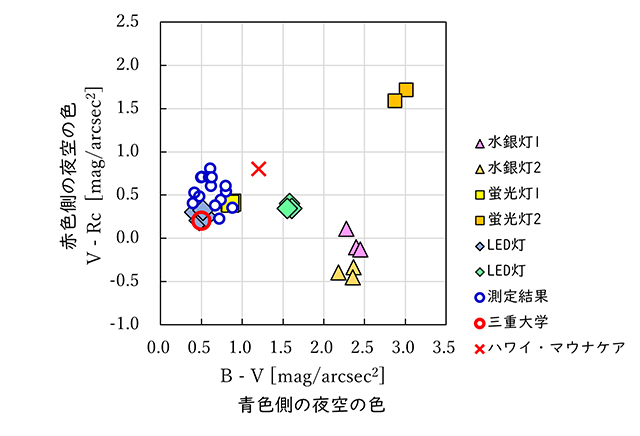 また、本学付近の夜空が明るいのは、もちろん街灯などの人工光の影響ですが、一口に街灯と言ってもさまざまな種類のものがあり、街灯の種類毎に波長特性が異なります。つまり街灯の色と夜空の色を比較すれば、どのような照明装置が光害に影響しているか推定することができそうです。図3はさまざまな人工光源の色とさまざまな場所での夜空の色を比較したものです。本学付近の夜空の色はLED灯の色と合致していることが分かります。このような波長特性やその時間変化をさまざまな地域で測定していくことで、地域の特性に応じた光害対応ができるのではないかと考えています。