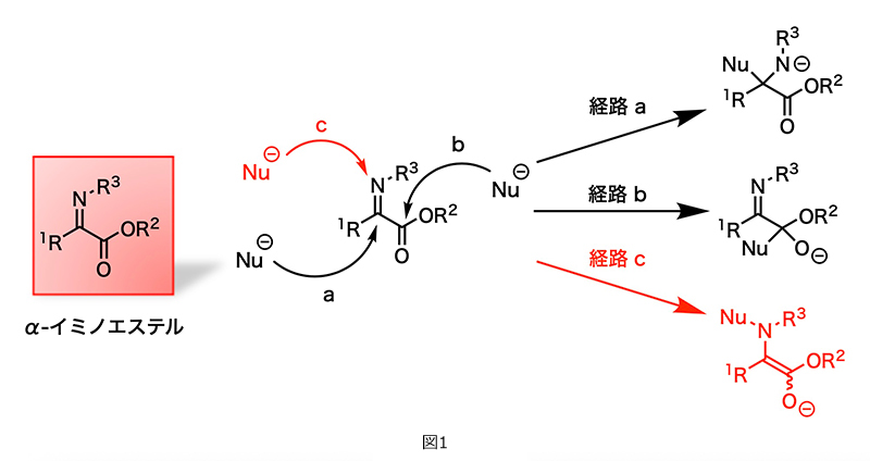 α-イミノエステルと呼ばれる化合物は、その名前にあるように分子内にエステル部位を有しています。これは電気陰性度の影響によって反応性の高い物質となっているため、α-アミノ酸前駆体として有機合成反応に汎用されています。一般的に、求電子試薬(電子不足な試薬)と求核試薬(電子豊富な試薬、Nuと表記)を反応させると電子不足な部分に付加反応が起こり、新しい結合が形成されます。これを求核付加反応と呼びます。α-イミノエステルを求核試薬と反応させると、求核付加はイミノ炭素(N=CのC)やエステル部位(C=OのC)で起こります(図1, 経路 aおよび b)。これは電気陰性度の影響のために起こる普通の反応といえます。一方、ごく稀にではありますが、イミノ窒素(N=CのN)が攻撃される反応が進行する場合があります(経路 c)。このような反応は分子の極性が逆転しなければ起こりえない反応であり、極性転換反応と呼ばれています。極性転換反応は従来の合成経路よりも効率的かつ合理的な反応経路の構築が可能で、有機合成において非常に重要な分野となっています。