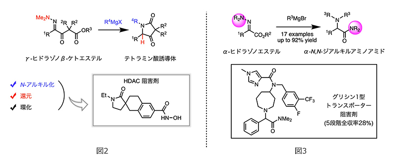 また、私たちはα-ヒドラゾノエステルと呼ばれる新たな化合物も合成し、極性転換反応を起こすと窒素上の置換基の分子内移動を伴った新しい反応が起こることを発見しました。そしてこの反応を鍵反応とするグリシン1型トランスポーター阻害剤を合成することにも成功しました。(図3)