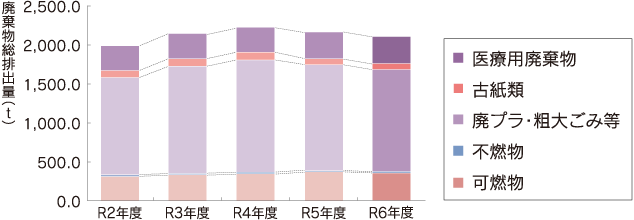 令和6年度の廃棄物総排出量については、令和5年度より不燃物と古紙類、医療用廃棄物が増加し、可燃物と廃プラ・粗大ごみなどが減少しており、廃棄物全体として減少しました。また、本学は令和4年4月1日から施行されたプラスチックに係る資源循環の促進等に関する法律における多量排出事業者となり、排出の抑制・再資源化などに関する目標を定め、これを達成するための取り組みを計画的に実施しています。