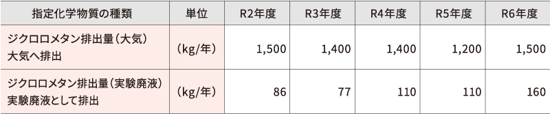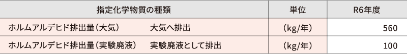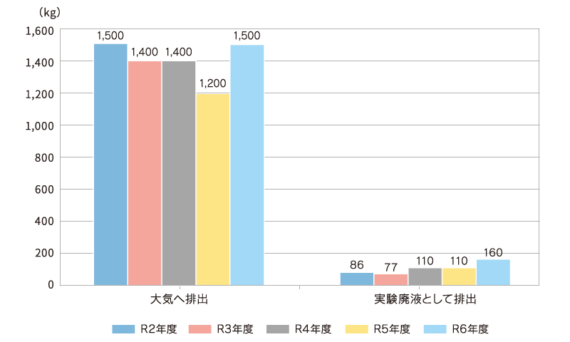 令和6年度は、政令番号186のジクロロメタン(別名:塩化メチレン)および政令番号411のホルムアルデヒドを対象物質として報告しました。双方とも沸点が低く揮発しやすい性質のため、実験廃液として排出(移動)されたもの以外は大気中に排出されたと考えられます。また、公共用水域への排出は検知されていないため、土壌汚染などはありません。
