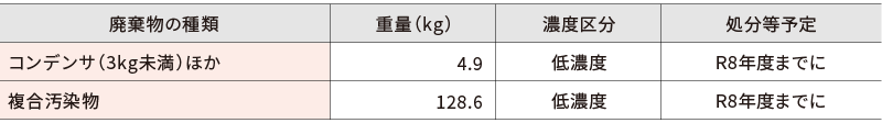 令和6年度末時点で本学が保管しているPCB廃棄物は以下の表のとおりです。