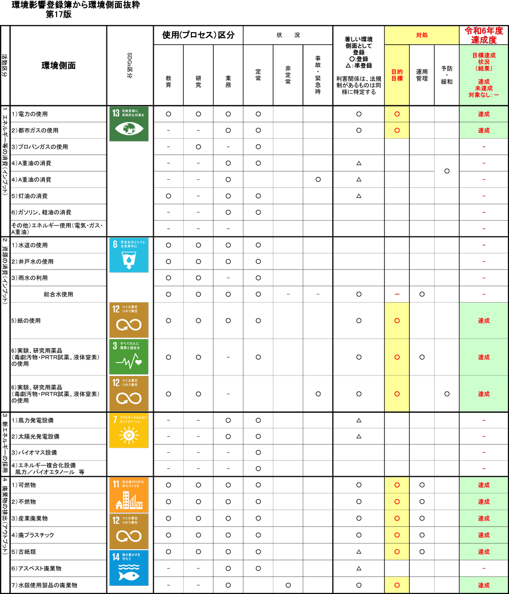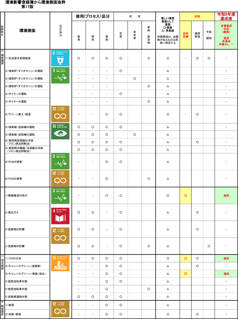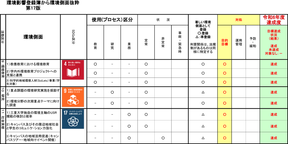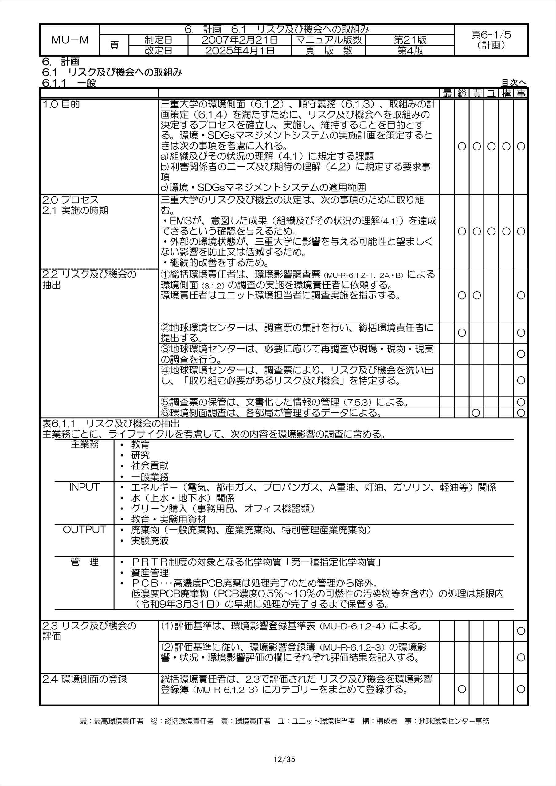 本学の環境に関する潜在的な環境課題へのリスクの特定、評価および対応方法は、「三重大学環境・SDGsマネジメントマニュアル」で特定をしています。