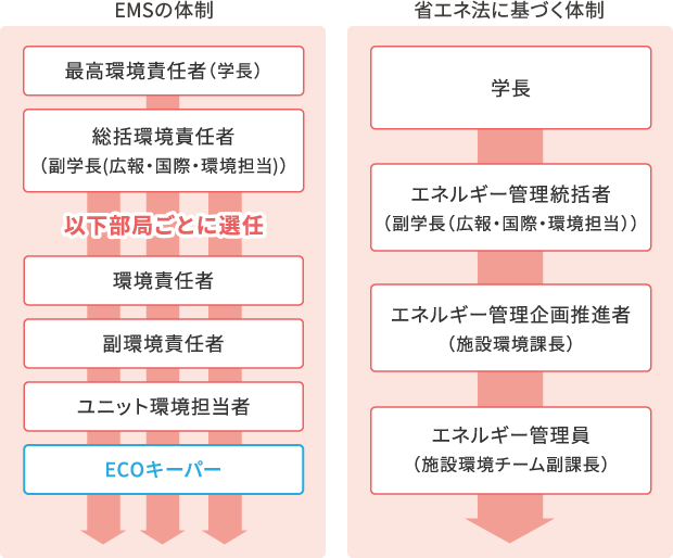 環境・SDGsマネジメントシステム(EMS)の体制として、環境担当副学長を総括環境責任者とし、部局ごとに環境責任者、副環境責任者、ユニット環境担当者を選任し、ユニット環境担当者の補助者として、ECO(エコ)キーパーを選任し省エネ活動を行っています。ECOキーパーは、エネルギーマネジメントシステム(EMS)からデマンド警報メールを受信したら、不要な照明、空調の停止などを行うこととしています。