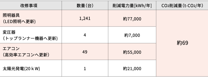 下表は改修工事で実施した機器更新、太陽光発電設備の新設により削減したCO₂排出量をまとめたものです。