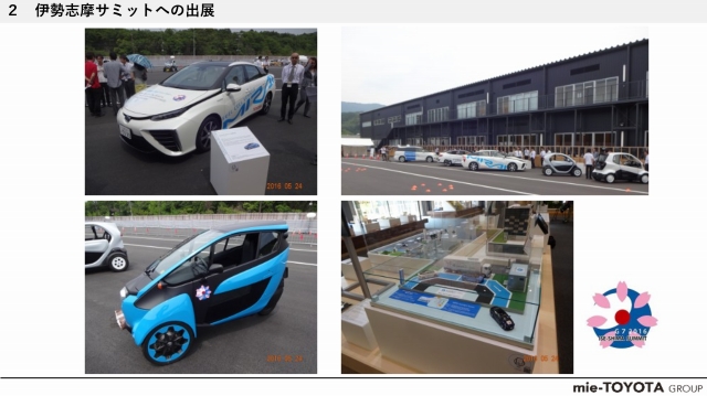 2つ目は、平成28年に開催された伊勢志摩サミット2016に出展を行い、水素ステーションに関する模型が屋内展示し、水素エンジン車を屋外展示場に展示したと説明がありました。