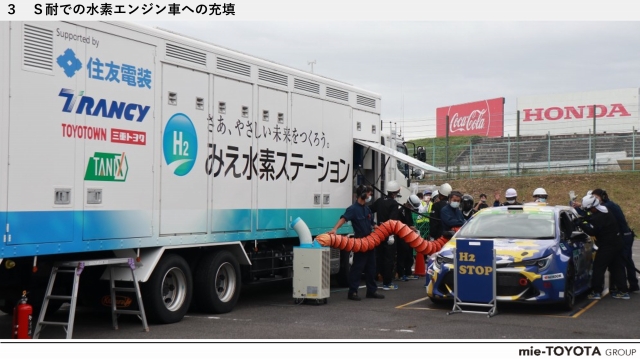 3つ目は、国内で行われた自動車レースのS耐(スーパー耐久)で、移動式水素ステーションを利用した水素エンジン車への充填を行ったと説明がありました。