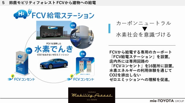 その他、芸能活動をするグループのツアー三重公演が開催された際に、燃料電池自動車MIRAIの水素発電の電力を楽曲演奏に活用されたことの説明がありました。また、令和6年11月1日に鈴鹿モビリティフォレストがグランドオープンされ、燃料電池車(FCV)から建物への給電を行ったと説明がありました。