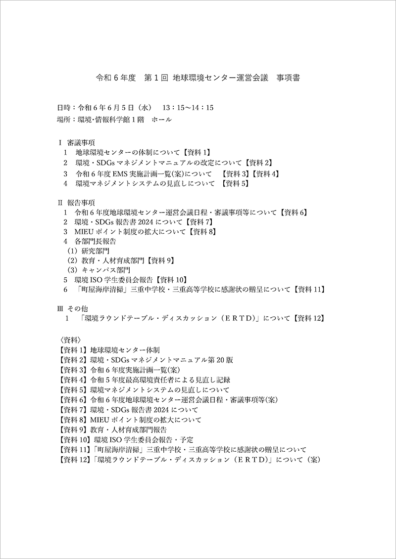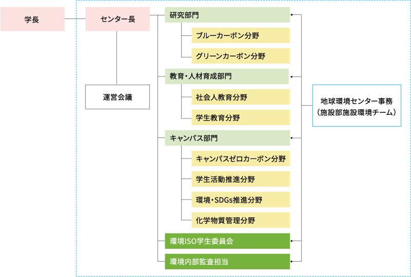 令和6年度は、国際環境教育研究センターの機能と役割を見直し、環境研究と環境教育の機能を強化するため地球環境センターに改組しました。センター内の部門も改編し、研究部門、教育・人材育成部門、キャンパス部門3部門の体制(前年は6部門)で、環境・SDGsマネジメントシステムの環境活動を協議しています。