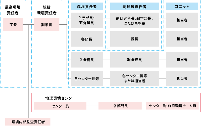 令和6年度は、総括環境責任者はセンター長1名と教職員27名と環境ISO学生委員会の委員長の1名を含めた29名(令和6年6月5日時点)で、環境・SDGsマネジメントシステム体制を構成し運用を行いました。体制のスリム化を行い前年のセンター員数から12名減員して環境活動を進めてきました。