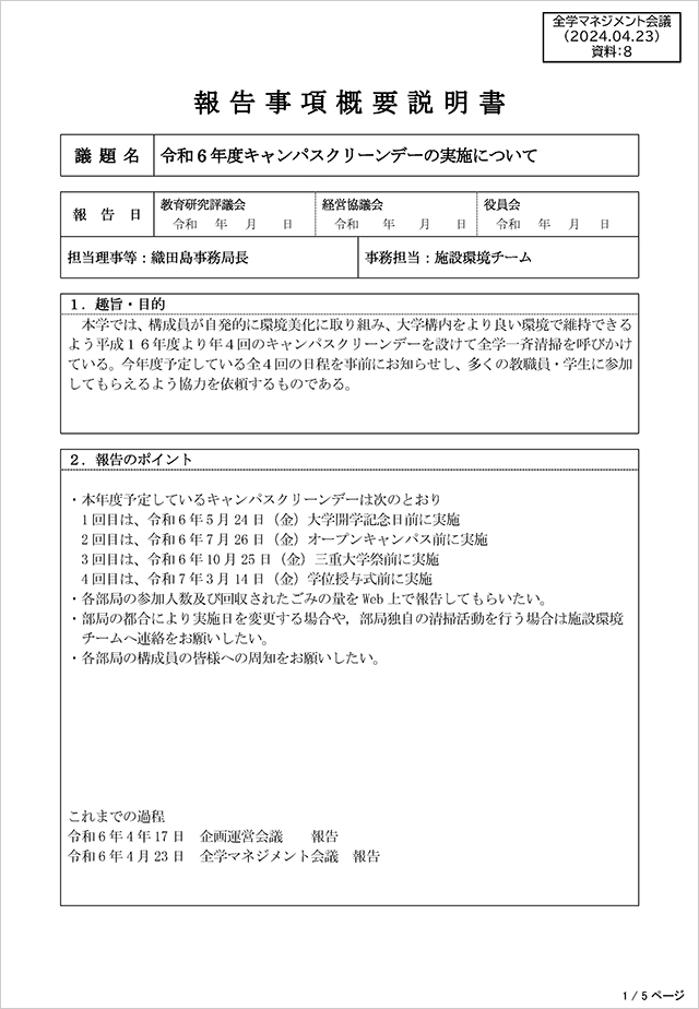 全学マネジメント会議は令和6年度に19回開催され、大学の運営方針、戦略及び諸課題について、全学的な観点から意見を集約し、検討を行うとともに、全学及び部局等共通の管理運営事項に関する調整・連絡を行うことを目的として本学の事業を戦略的に実施していきます。第2回(R6.4.23)では「令和6年度キャンパスクリーンデーの実施について」の周知報告が行われ、第4回(R6.5.28)に「MIEUポイント制度の拡大について」、第6回(R6.7.9)に「照明器具のLED化推進事業について」の報告が行われました。