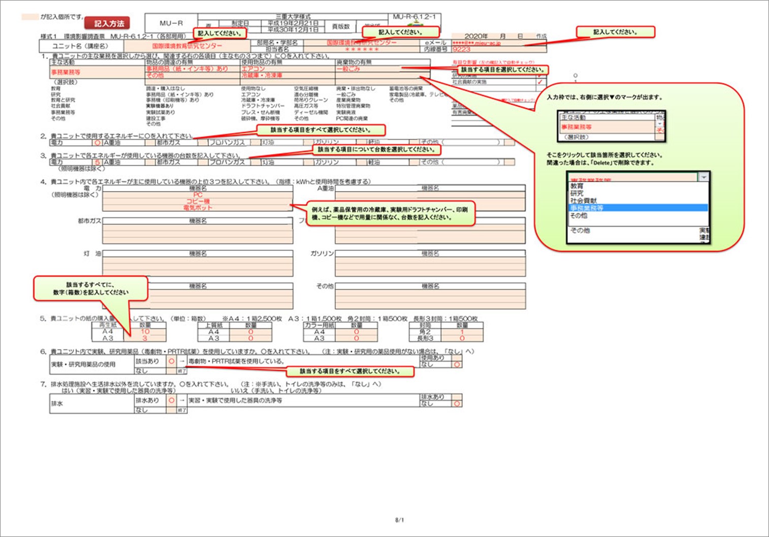 調査対象部局の主な活動、物品調達の有無、廃棄物の有無、使用するエネルギー、毒劇物等試薬の使用の有無など - ・調査対象: