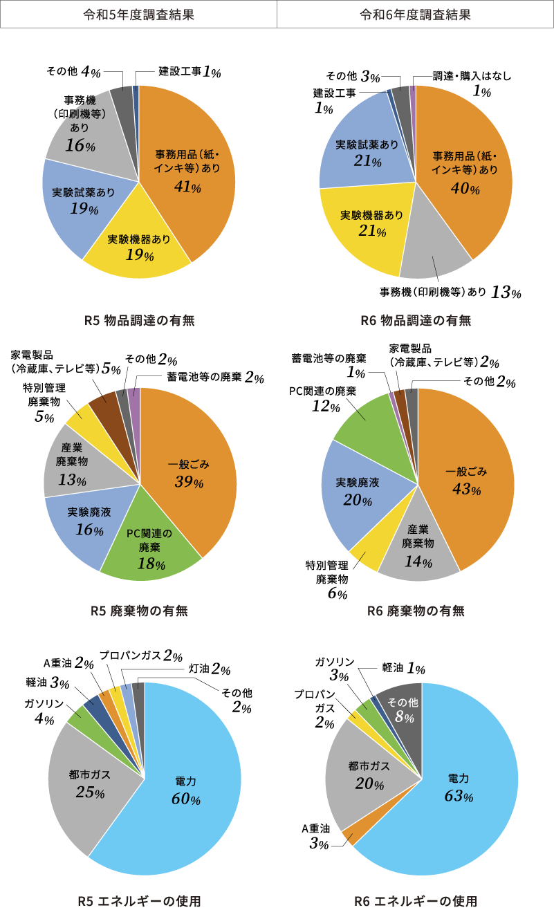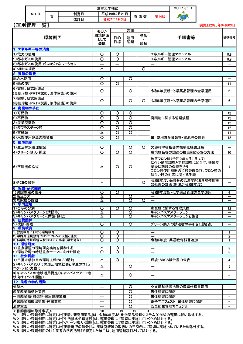 なお、令和6年度の環境に影響を与える項目(環境側面)の調査に関しては、令和5年度は155項目の調査を行っていましたが、令和6年度から化学薬品管理システム(CRIS)の全学運用開始に伴い、主な化学物質薬品は環境影響調査票から削除し、「環境影響登録簿の評価項目」も削除しています。